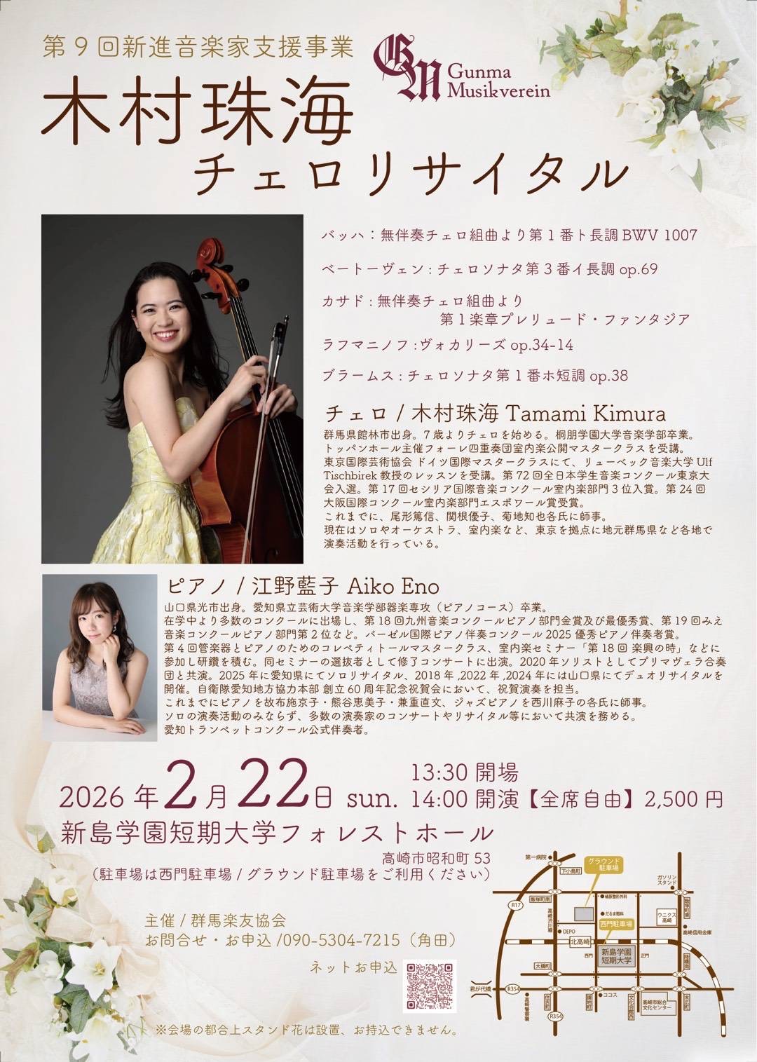 木村珠海 チェロリサイタル 2026 2/23 日時 2026/2/22(日)13:30開場 / 14:00開演 会場 新島学園短期大学フォレストホール群馬県高崎市昭和町53(Map) 出演 木村珠海、江野藍子 archive URLをコピーしました!